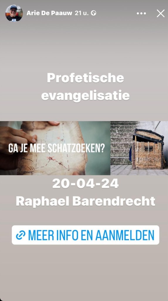 Op 20 april a.s. gaan we in Barendrecht, bij de Raphael gemeente Waterport, weer een evangelisatie training houden. Omdat we niet met banners en stoelen het winkelcentrum in mogen, gaan we weer Schatzoeken.