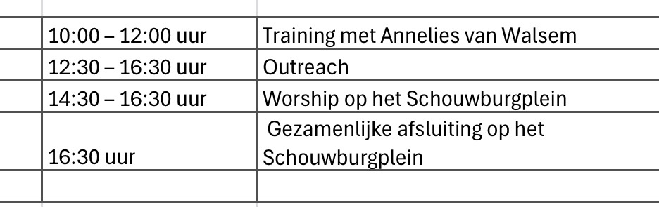 Vanaf 14:30 uur vindt op het Schouwburgplein het worship event plaats. Zo laten we Rotterdam zien én horen dat Jezus leeft. Om 16:30 uur sluiten alle mensen die op outreach zijn geweest aan, delen we wat God heeft gedaan en sluiten we de dag met elkaar af.